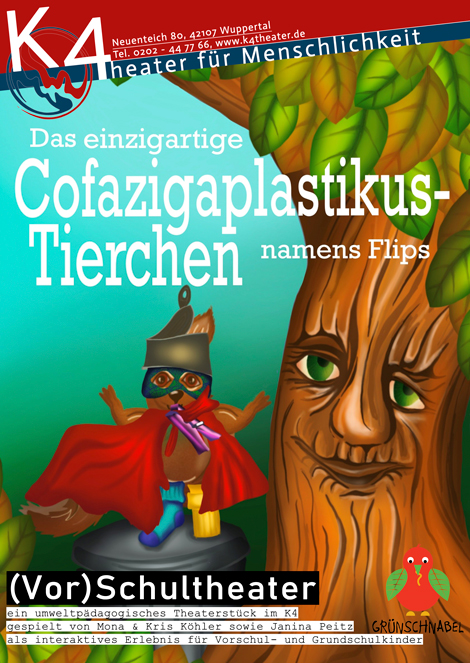 „Das einzigartige Cofazigaplastikus-Tierchen namens Flips“ ist ein interaktives Theatererlebnis für Vorschul- und Grundschulkinder. Das umweltpädagogische Theaterstück im K4 Theater für Menschlichkeit wird gespielt von Mona & Kris Köhler. Den Dialog sowie thematische Einheiten mit Mitmachcharakter übernimmt die Natur- und Umweltpädagogin Janina Peitz. Das Theaterstück setzt den Fokus auf die Themen Natur- und Umweltschutz, Müllvermeidung sowie ein respektvoller Umgang miteinander. Insgesamt wird eine Programmdauer von ca. 90 Minuten angesetzt.